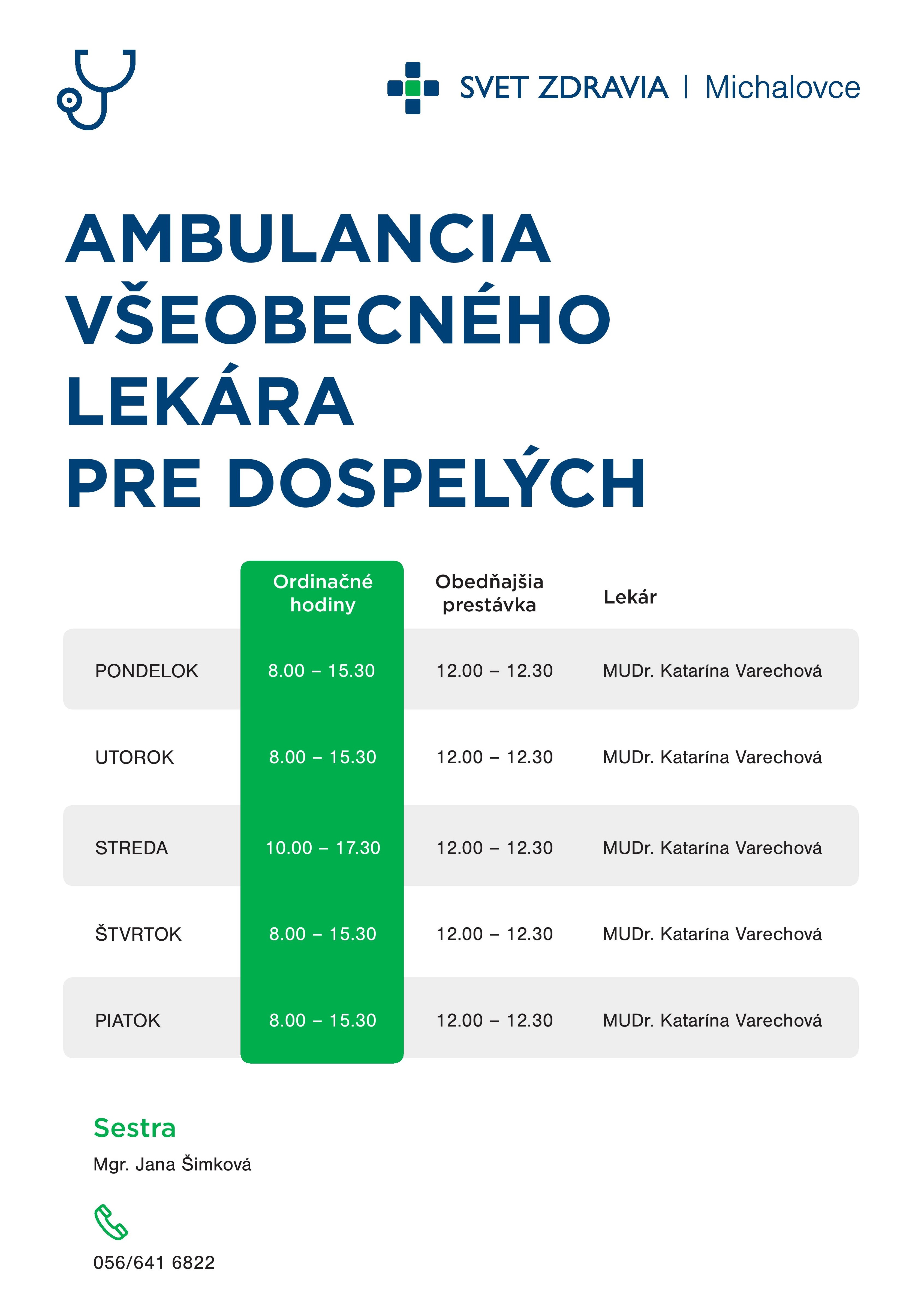 Na preventívne prehliadky v ambulancii plánujú vyhradiť jedno popoludnie v týždni tak, aby chorí ľudia neprichádzali do kontaktu so zdravými. Pacienti tiež majú možnosť dohodnúť si v určené dni vopred termín vyšetrenia alebo si objednať recept dlhodobo užívaných liekov. Lekárka Varechová je pacientom k dispozícií každý pracovný deň do 15:30, okrem stredy, kedy sú ordinačné hodiny od 10:00 až do 17:30 hod.